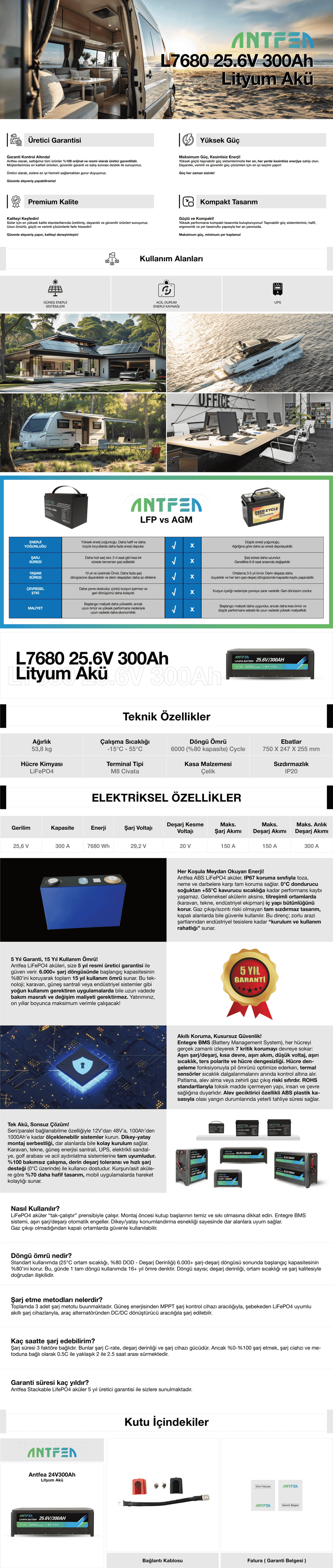 Antfea L7680 25.6V 300Ah İstiflenebilir Lityum Akü LiFePo4